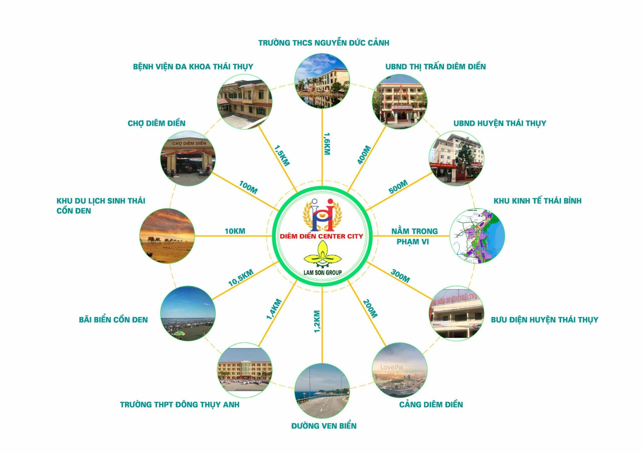 Tâm điểm kết nối các KCN – Đô thị: Liên Hà Thái, Thụy Trường, Tân Trường 1, 2, Thụy Lương, Thái Thượng, Thái Đô. Phía Đông, view sông Diêm Hộ, hướng ra Biển Đông.